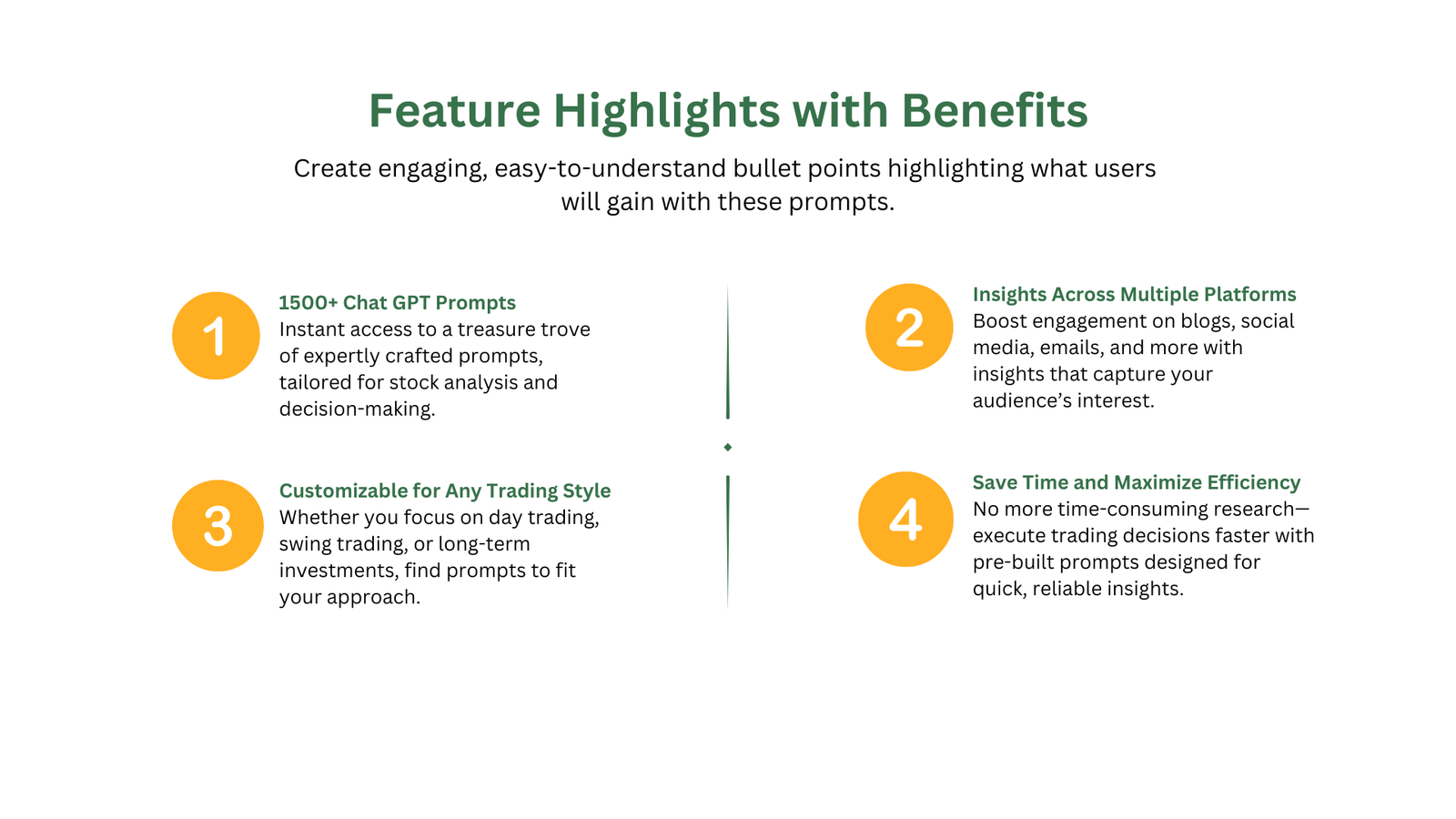 These prompts offer insights on stock analysis techniques, entry/exit strategies, and market trends, giving you an edge in making informed decisions.